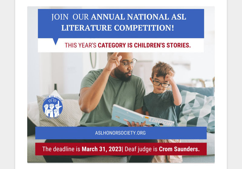 The ASL Honor Society is sponsoring an annual ASL literature competition, featuring cash prizes for top winners. The entry deadline is March 31, 2023.
