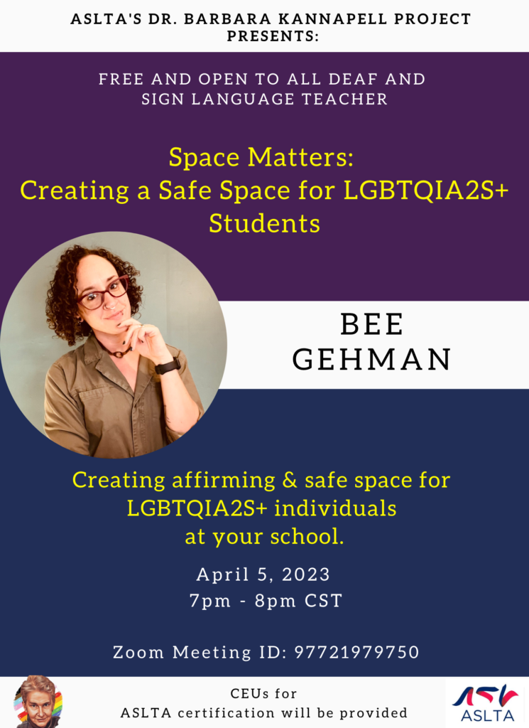 ASLTA’s BK Project is sponsoring a online workshop on April 5, 2023. Time: 7-8 pm CST.