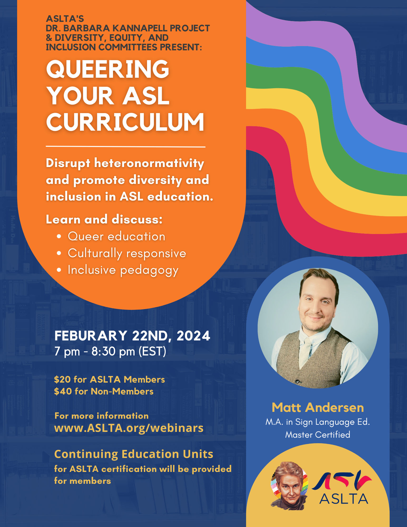 Embark on a journey of campus reinvention in response to the evolving demographics of higher education! As colleges worldwide adapt to shifting student populations, the focus on equity-minded practices becomes paramount. Join the conversation on inclusive education, specifically addressing the challenges faced by LGBTQIA+ students in achieving a sense of belonging on campus. This interactive workshop equips ASL educators with diverse strategies, both in and out of the classroom, to foster optimal student participation and enhance the on-campus experience for LGBTQIA+ identifying students. Don’t miss the opportunity to explore practical approaches for creating an inclusive and supportive educational environment.